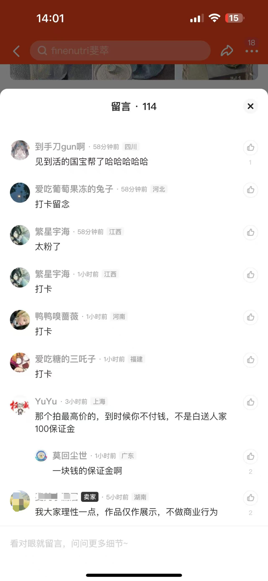 此后,他将作品再次上拍,没想到被网友炒到了如今的价格。“事情有点超出预料,感觉有些失控了,我联系平台,但被告知无法终止拍卖,所以我在评论区回复说,作品仅作展示,不做商业行为”。